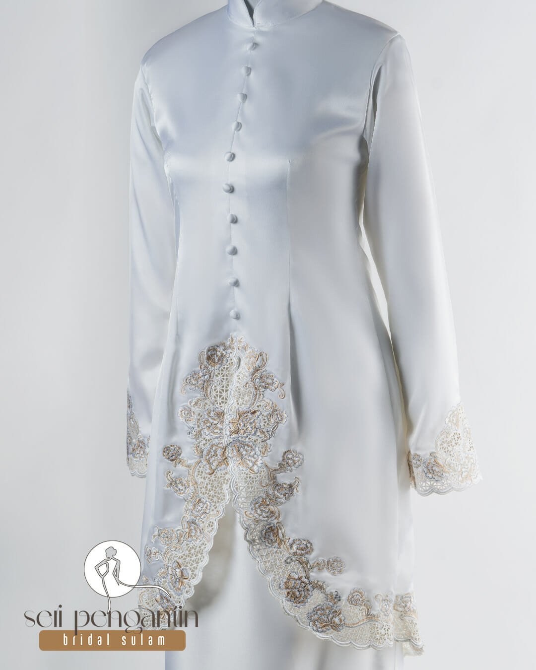 Jadi, sulaman kerawang yang cantik dan senada pada fabrik polos putih ini akan menaikkan lagi seri pemakainya, iaitu bakal pengantin apabila disarungkan pada majlis akad nikahnya nanti. Ia menjadikan pengantin tersebut nampak ayu dan tidak keterlaluan yang sesuai dengan majlis akad nikah yang amat bermakna bagi pasangan yang bergelar raja sehari.