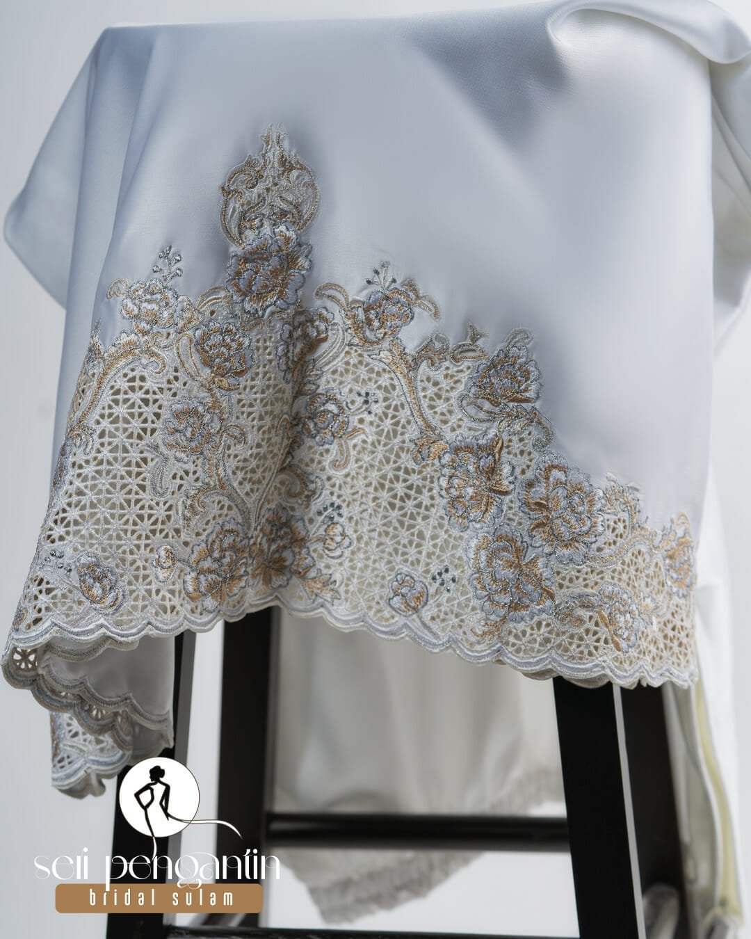 Jadi, setiap busana yang disarungkan oleh pengantin, akan lebih berseri jika ditambahkan dengan aksesori seperti sulaman kerawang. Ia akan nampak elegan pada kelasnya yang tersendiri. Sulaman kerawang pada kali ini dihasilkan penuh pada kebaya fishtail yang dipadankan dengan kain duyung.
