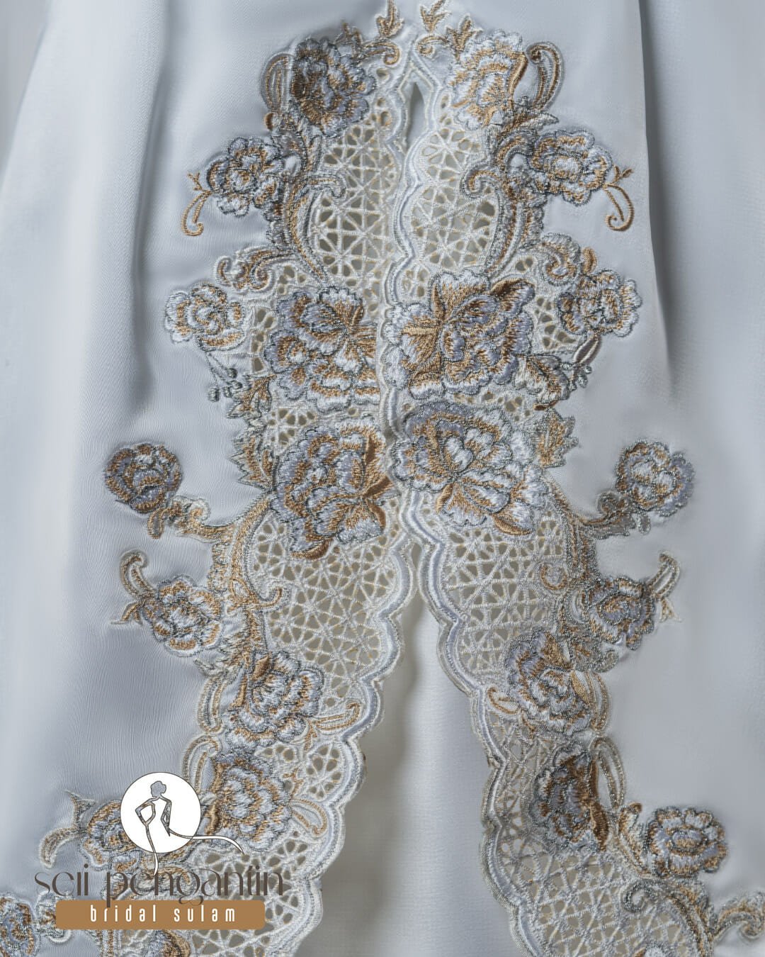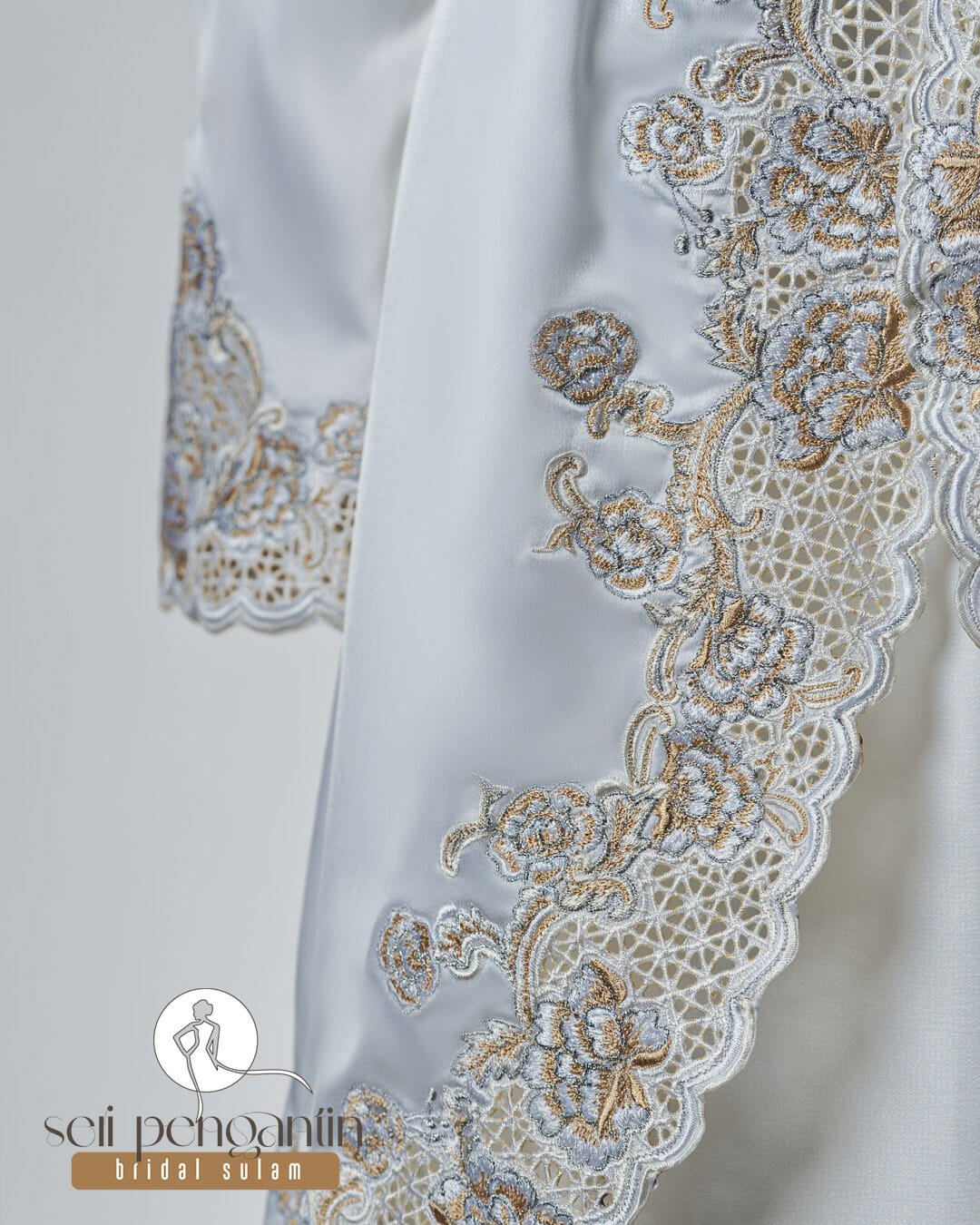 Oleh kerana warna latar fabriknya adalah putih, warna sulaman kerawang yang dihasilkan adalah senada. Cuma untuk menaikkan serinya, penambahan warna coklat keemasan dan juga warna perak digunakan pada sulaman kerawang motif bunga peony ini. Dengan ini, si pemakai akan bertambah manis dengan adanya aksesori kerawang yang dihasilkan senada pada baju kebaya nikah fishtail ini.