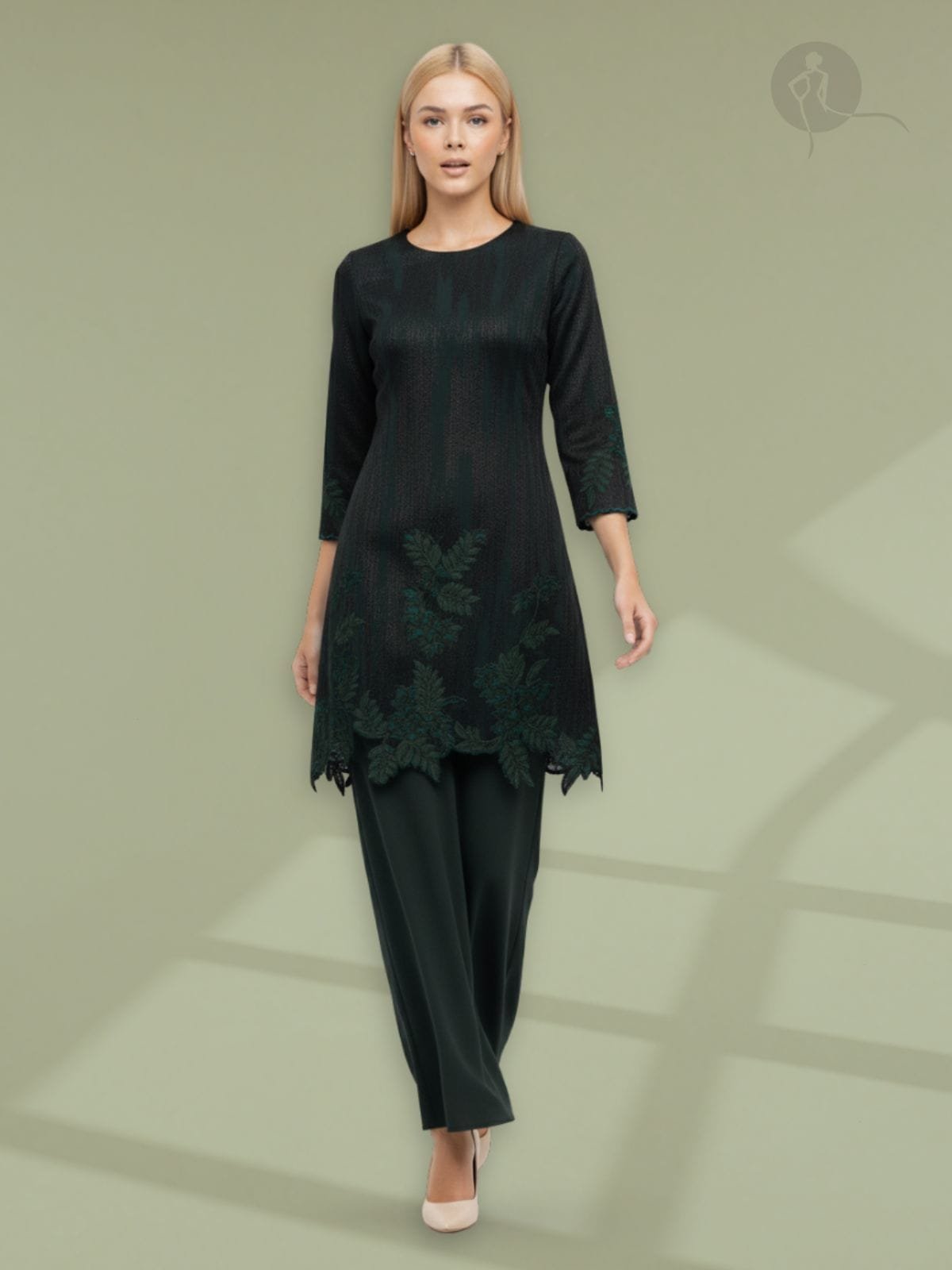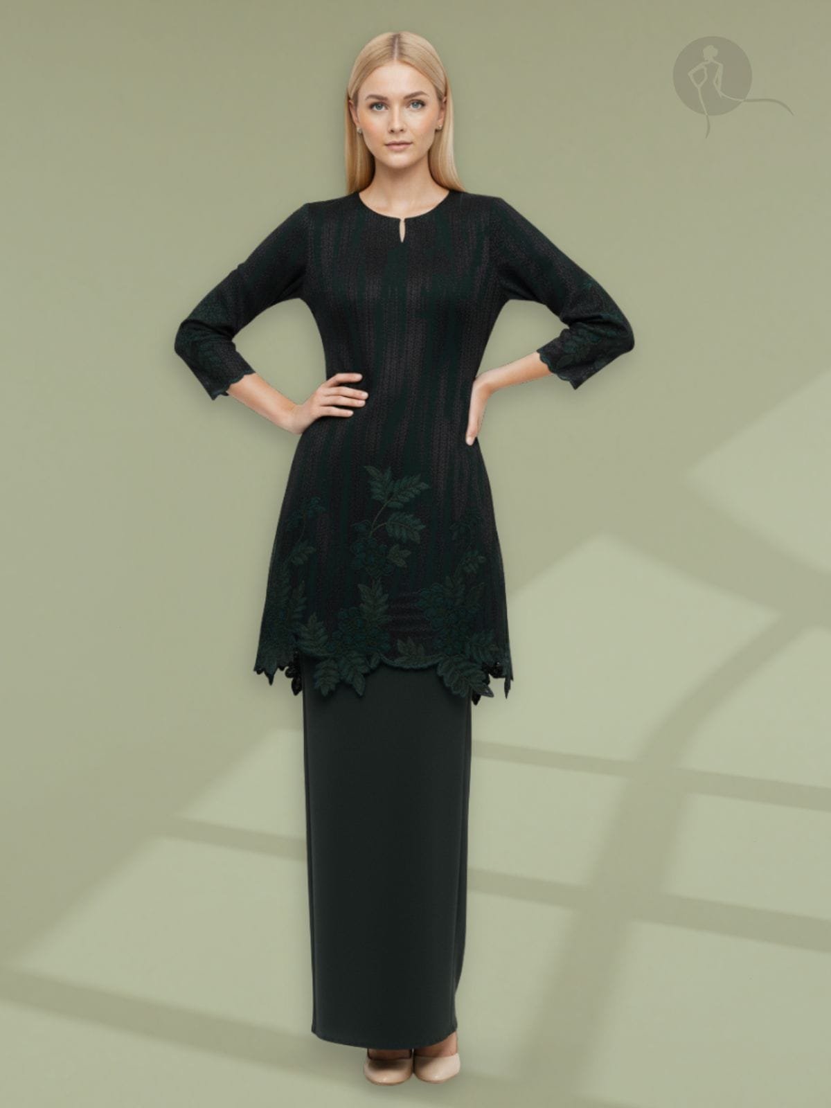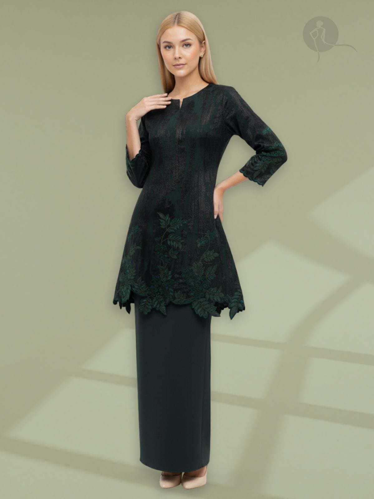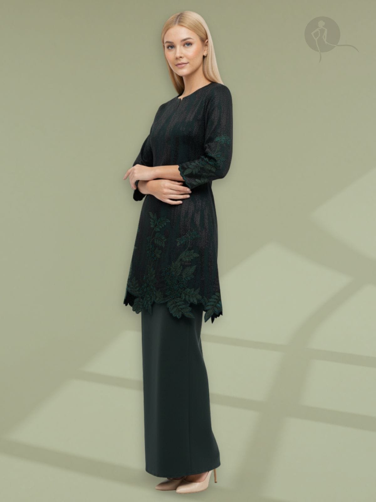 Dihiasi dengan sulaman bunga senduduk dan motif paku pakis yang halus, busana ini menampilkan keindahan flora tempatan dalam bentuk yang eksklusif dan mewah. Setiap perincian dijahit dengan teliti untuk menampilkan gaya sopan, ayu, dan memikat pada hari penuh bermakna.