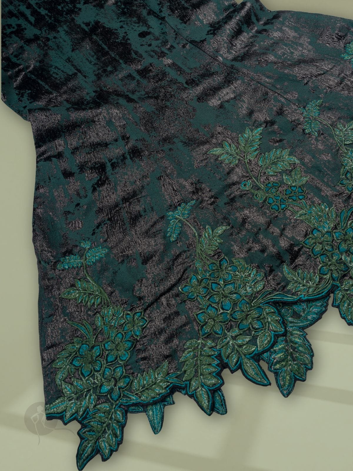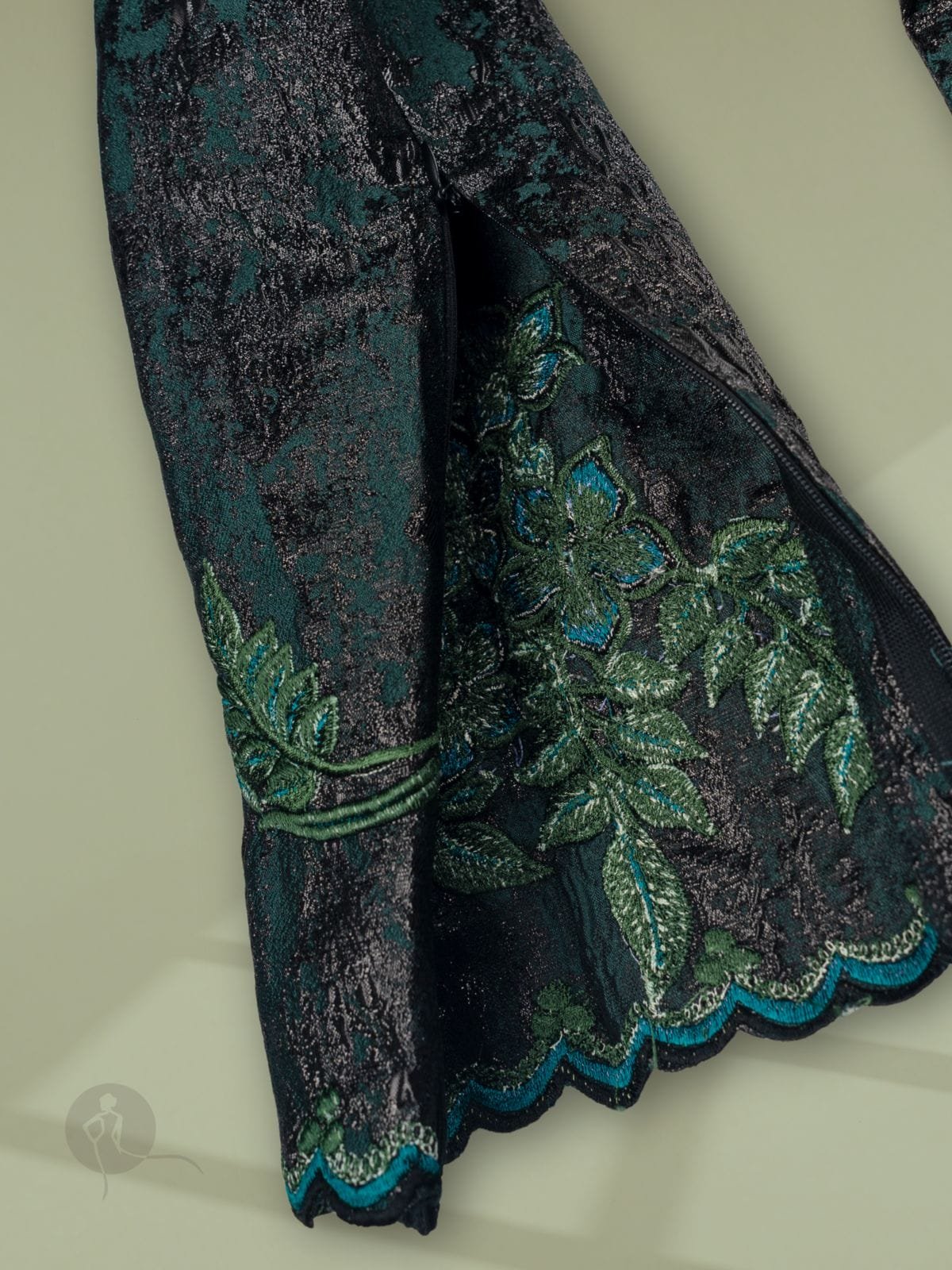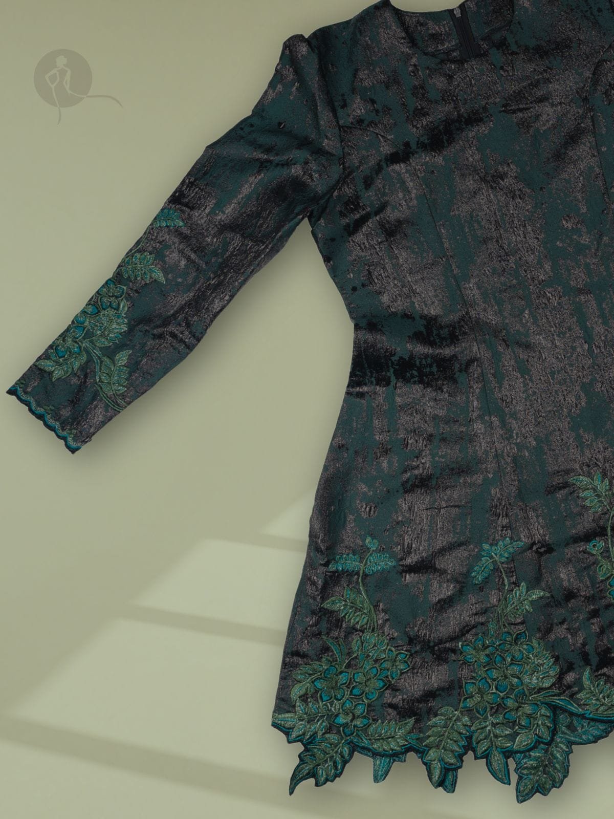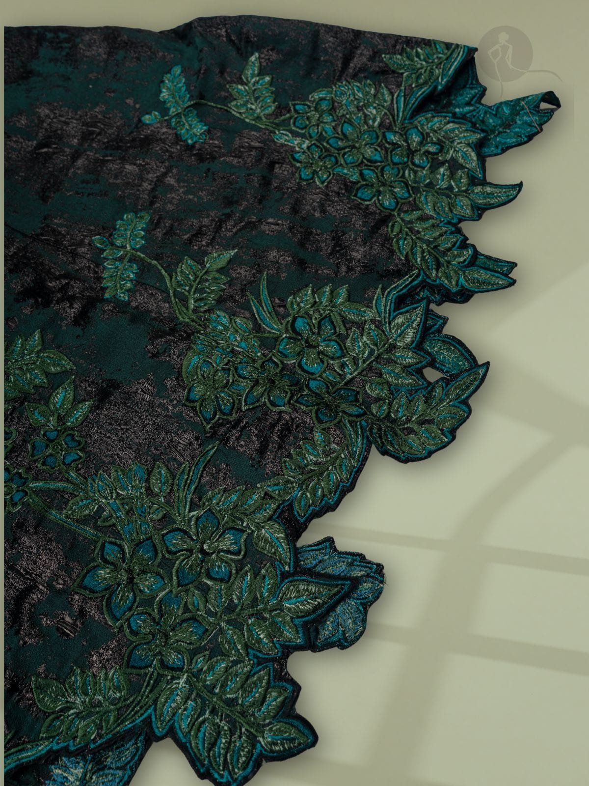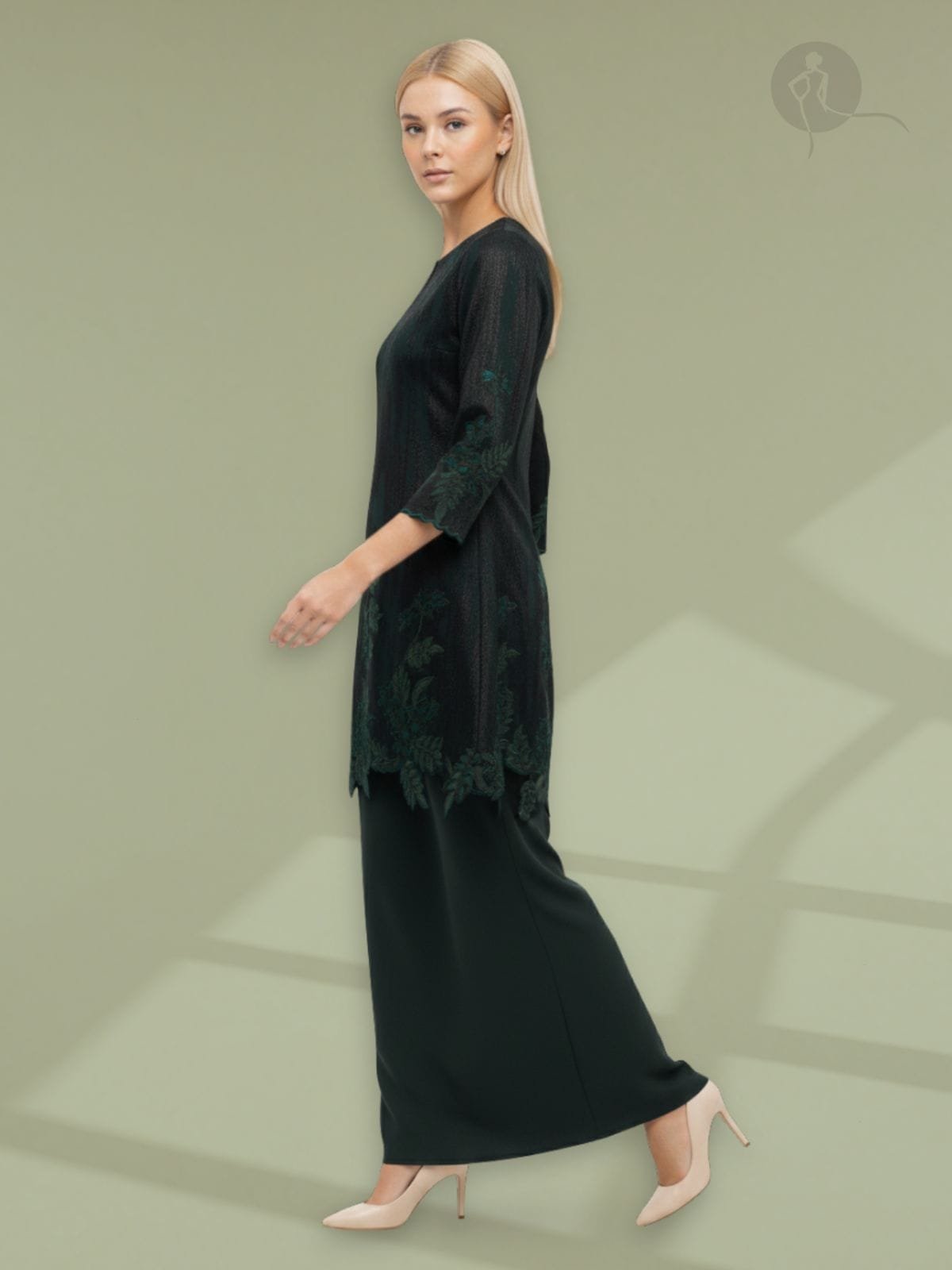 Dihiasi dengan sulaman bunga senduduk dan motif paku pakis yang halus, busana ini menampilkan keindahan flora tempatan dalam bentuk yang eksklusif dan mewah. Setiap perincian dijahit dengan teliti untuk menampilkan gaya sopan, ayu, dan memikat pada hari penuh bermakna.